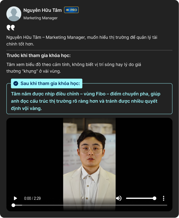 Sau buổi học thứ nhất, anh lần đầu tiên nhận ra đâu là nhịp đẩy, đâu là nhịp điều chỉnh và vì sao thị trường lại chạy theo những đoạn như vậy. Buổi thứ hai giúp anh biết cách kẻ Fibonacci đúng vị trí và xác định được vùng giá thị trường có thể phản ứng.